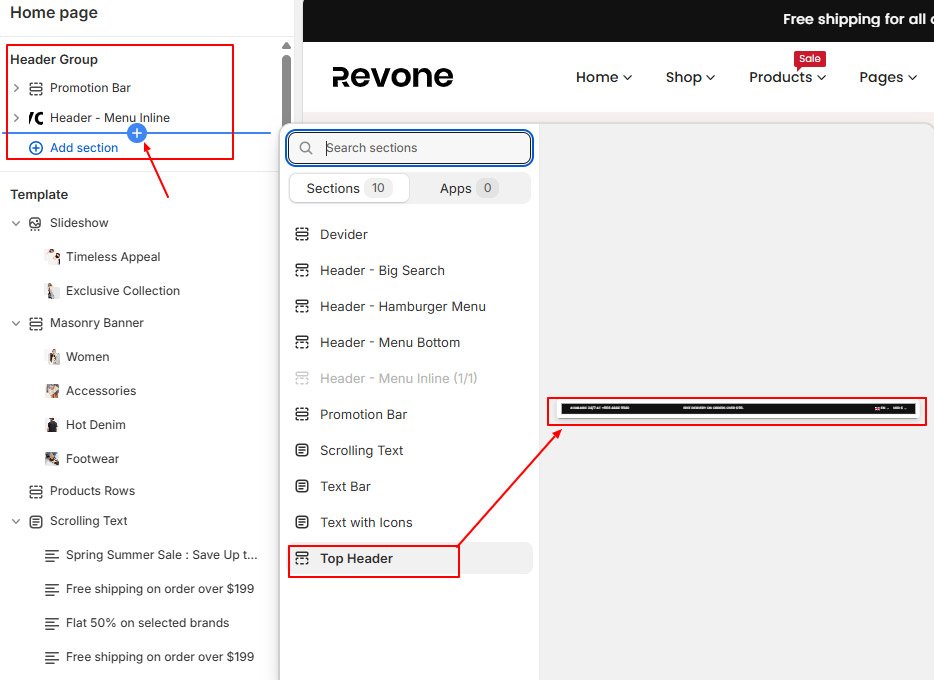 - In the theme editor, Home Page -> Header Group -> Click on Add section -> Top Header