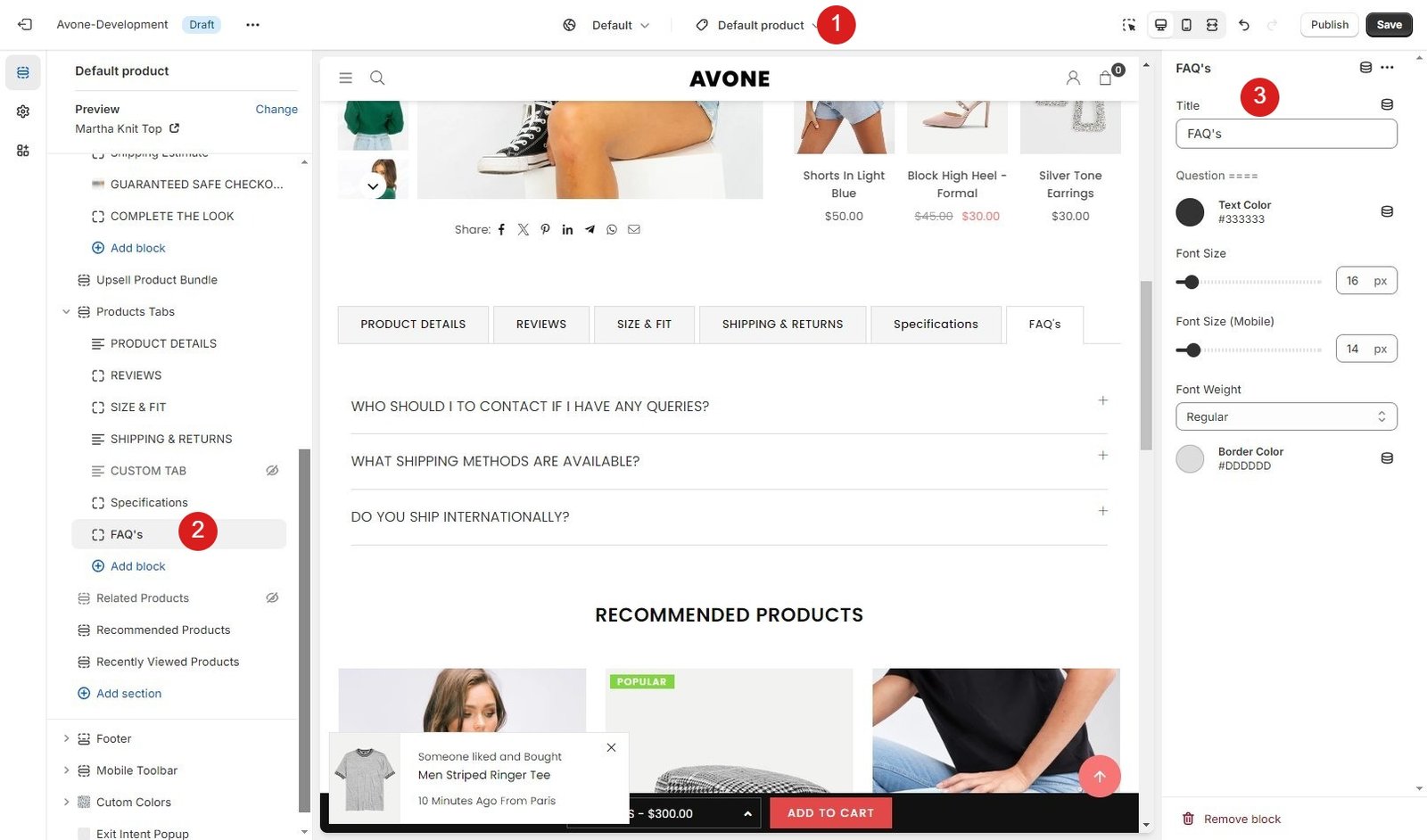 Now go to product page from theme customize, Click in Product Tabs section and Add block “FAQ’s” and click save.