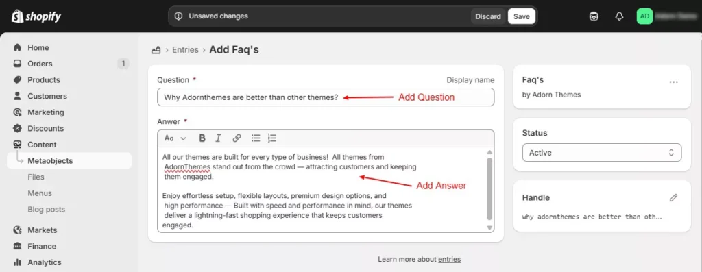 Go to Store Admin –> Content –> Metaobjects -> FAQs > Add Entry