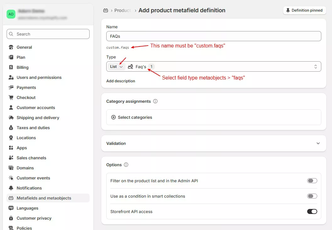 Now go to Metafields and metaobjects and create a metafield definition for metaobject Faqs created in steps 1.