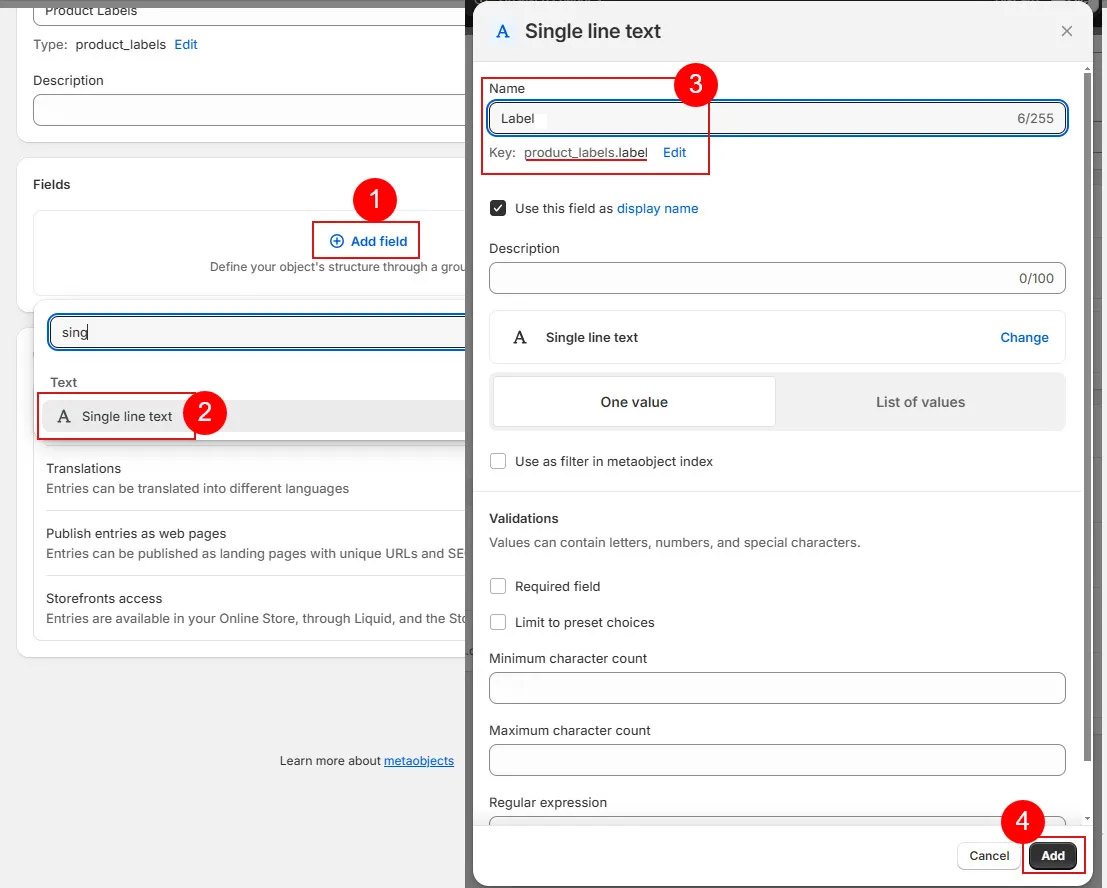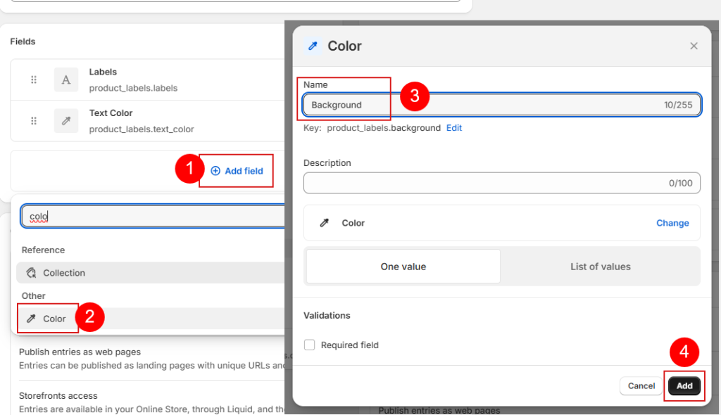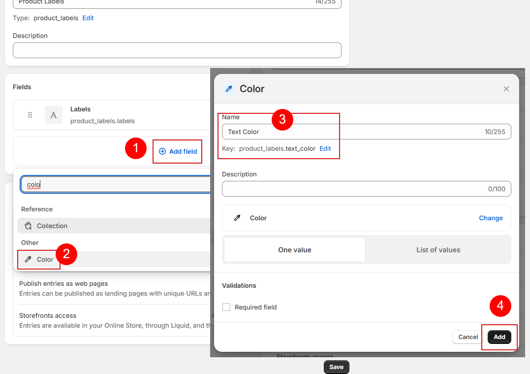 In the metaobject for Product Labels, Add three distinct fields: Label, Text Color, and Background, as illustrated below.