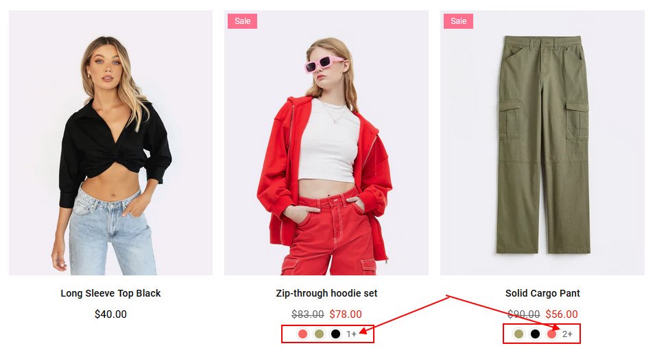 If your products have an extensive range of color swatches to showcase on the products grid, you have the option to limit the number of swatches displayed. This way, the next set of swatches will be shown as a count.