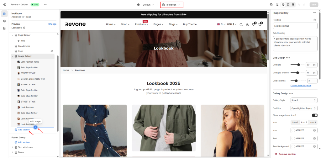 - In the theme editor, Select Pages -> lookbook from top dropdown menu.