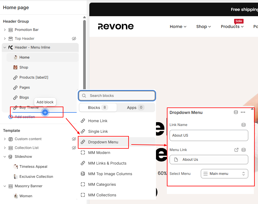- In the theme editor –> Click Header section -> Add block -> Click MM Links & Products