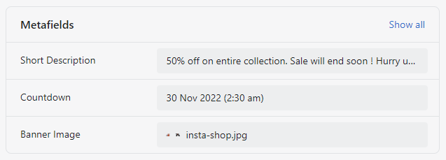 Follow below steps to create metafields for collection page banner image, short description and countdown.