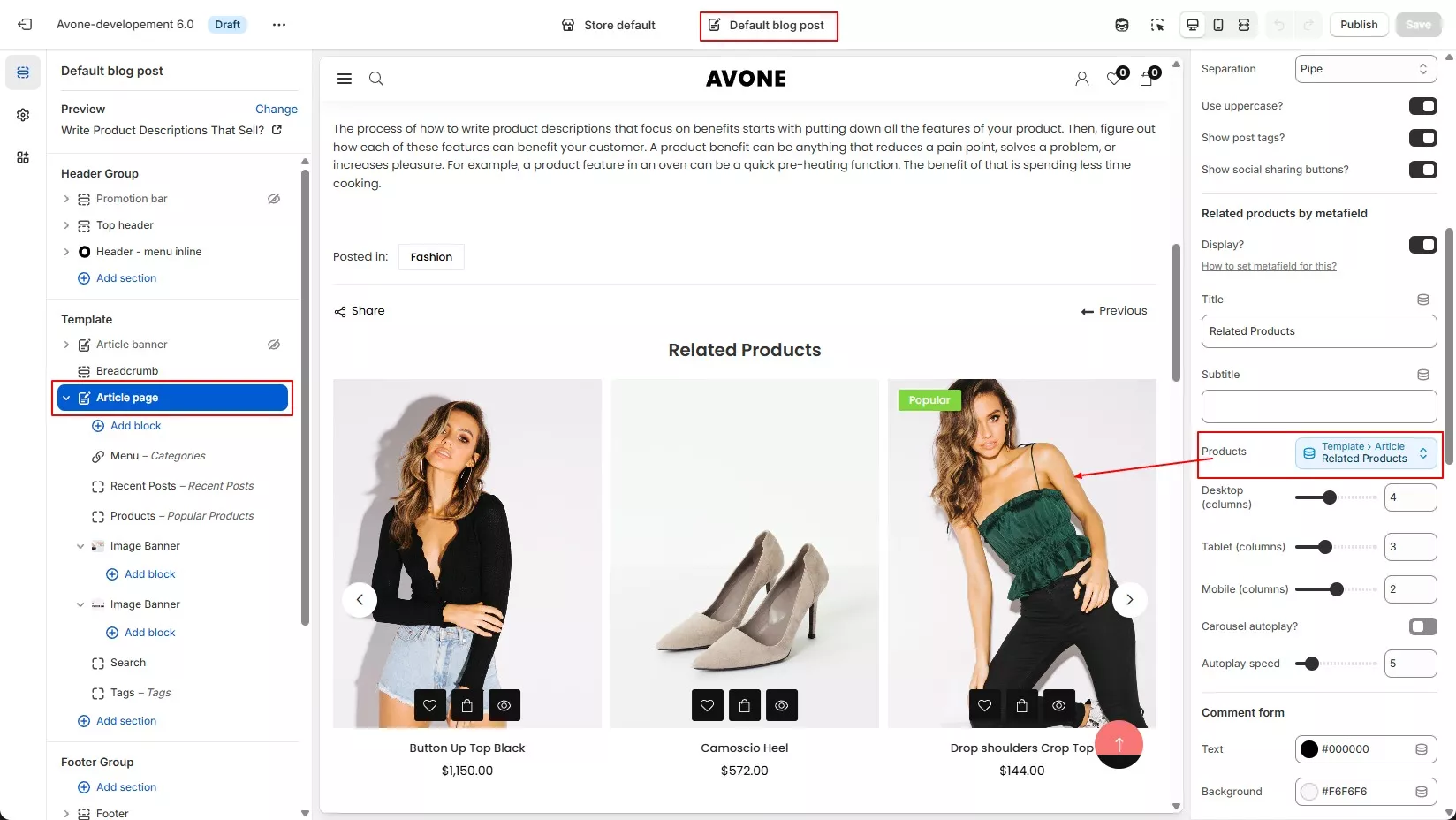 Please follow the steps below to display products list on blog article page.