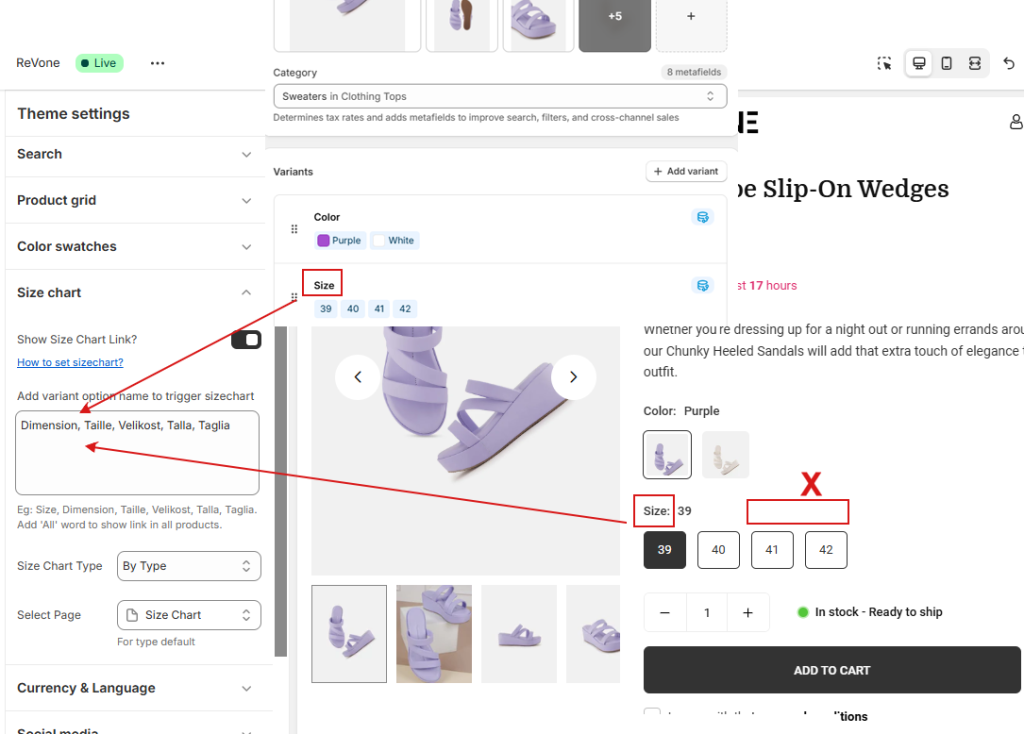 If you haven’t entered the correct variant option name in your theme settings, it will not show size chart link.
