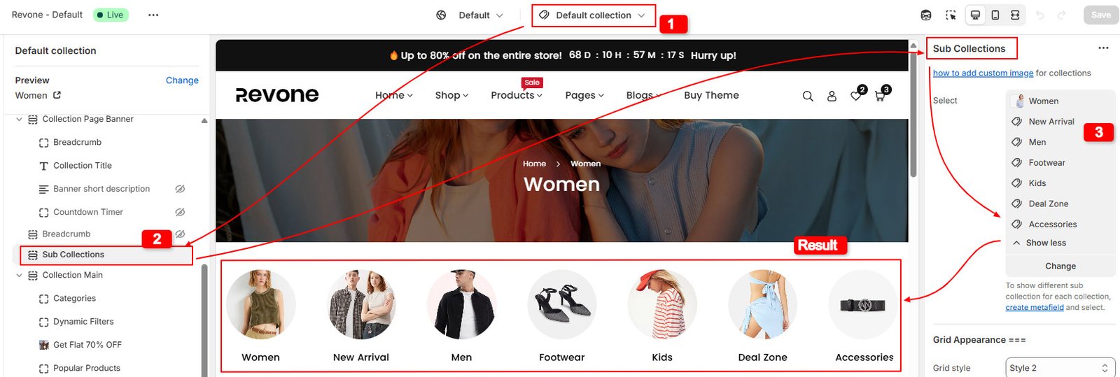 - In the theme editor, Choose Default Collection from top dropdown menu.